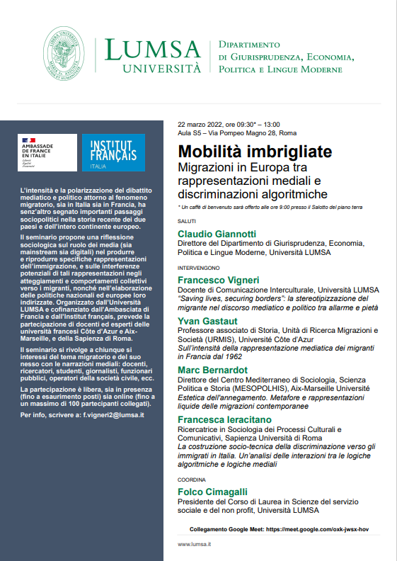 ROMA – Il 22 marzo 2023 – all’università LUMSA di Roma – si terrà un seminario intitolato “Mobilità imbrigliata. Migrazioni in Europa tra rappresentazioni mediali e discriminazioni algoritmiche”. L’evento, che avrà luogo dalle ore 9.30 alle 13.00, analizzerà il racconto che i media main stream e digitali fanno del fenomeno migratorio in Francia e in Italia e il modo in cui queste rappresentazioni mediali impattano sulle vite dei migranti e dei cittadini europei.