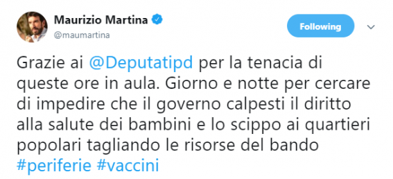 Soddisfatto il Segretario del Pd Maurizio Martina che su Twitter ringrazia i suoi “per la tenacia di queste ore in aula. Giorno e notte per cercare di impedire che il governo calpesti il diritto alla salute dei bambini e lo scippo ai quartieri popolari tagliando le risorse del bando #periferie #vaccini”.