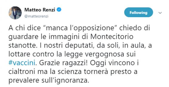 Immancabile anche il tweet di Renzi: “A chi dice «manca l’opposizione» chiedo di guardare le immagini di Montecitorio stanotte. I nostri deputati, da soli, in aula, a lottare contro la legge vergognosa sui #vaccini. Grazie ragazzi! Oggi vincono i cialtroni ma la scienza tornerà presto a prevalere sull’ignoranza”.
