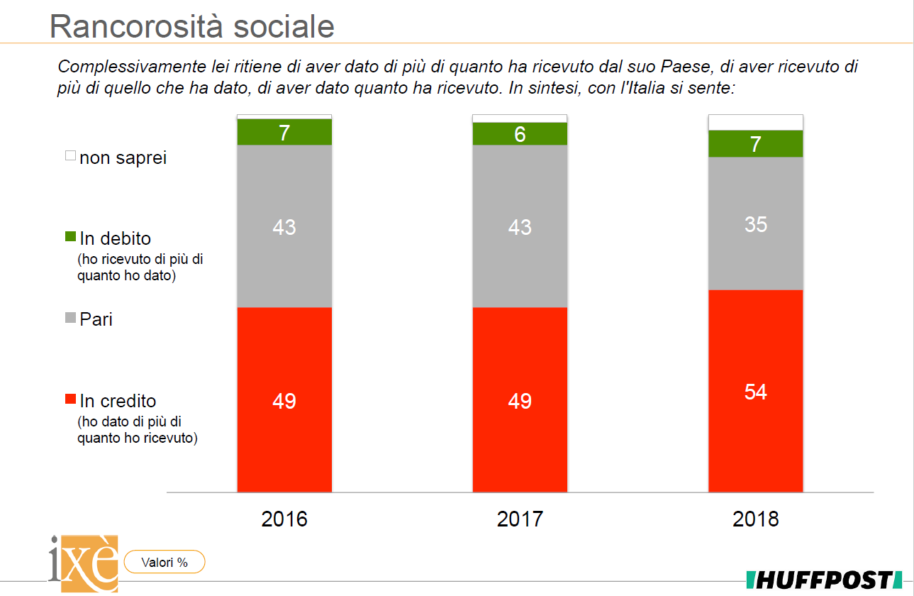 Significative però sono le indicazioni sul clima del paese. Si accentua in questa campagna elettorale la rabbia dei cittadini, il rancore dominante che destre e M5s interpretano meglio. Sale infatti la convinzione di un paese ‘matrigno’ cui gli elettori avrebbero dato più di quanto hanno ricevuto