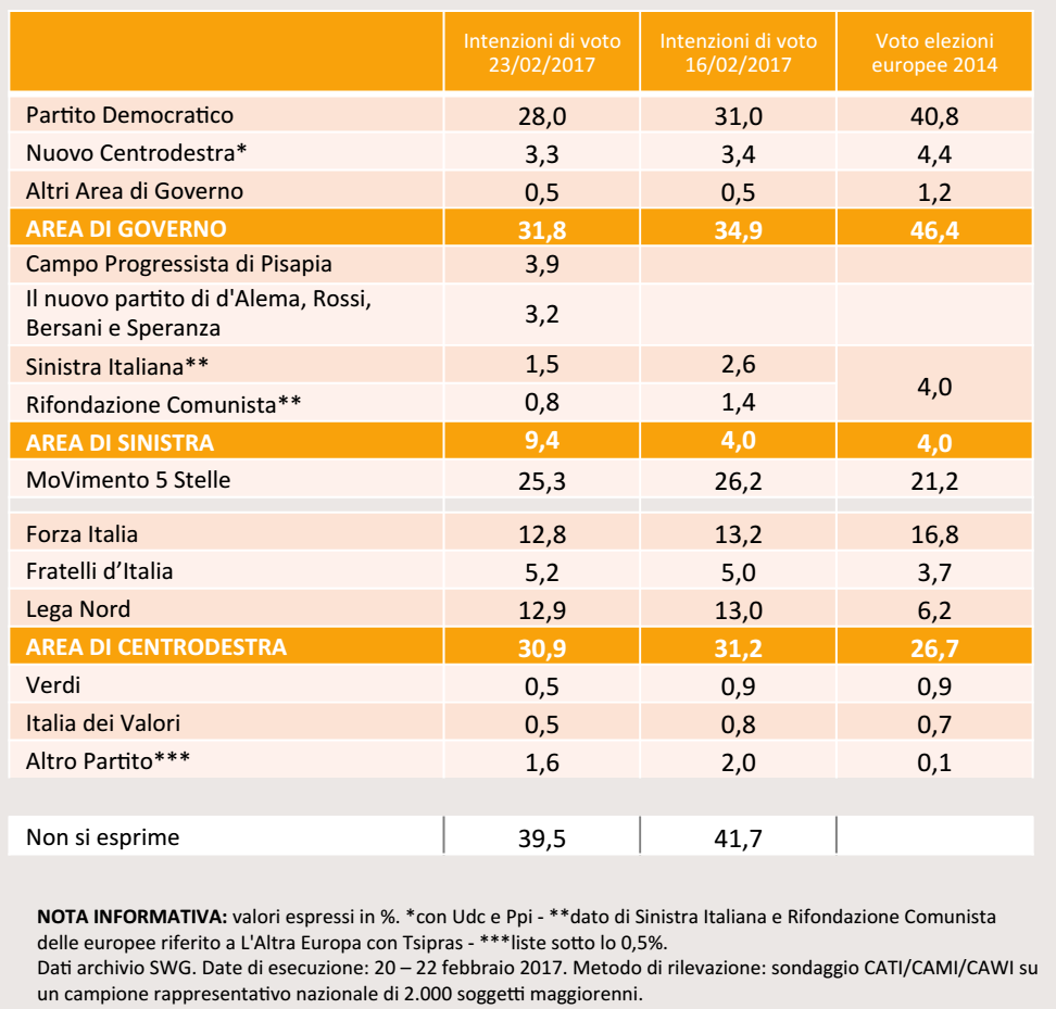Il sondaggio Swg dell’ultima settimana conferma il Pd in calo di 3 punti sulle intenzioni di voto, ma rimane il primo partito con il 28%. Le turbolenze della scissione quindi non sembrano intaccare la fiducia nel partito, anche considerando che l’istituto prevede due nuovi partiti a sinistra.