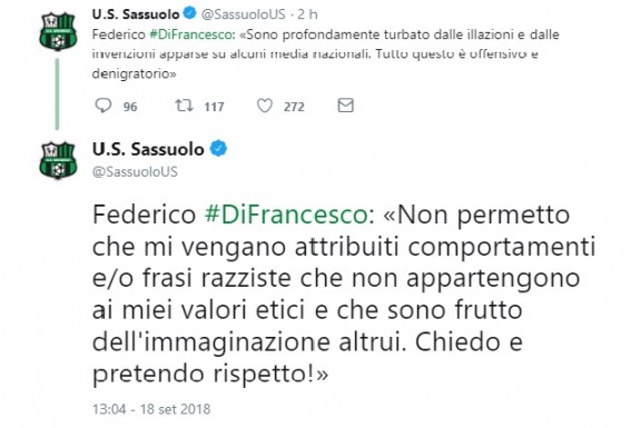 Continua a tenere banco il comportamento di Douglas Costa ai danni di Federico di Francesco, durante il recupero di Juventus-Sassuolo, giocata domenica scorsa. Dall’account twitter del Sassuolo arrivano le prime parole da parte di Di Francesco, che smentisce categoricamente “comportamenti e/o frasi razziste” che gli sono state attribuite come provocazione.