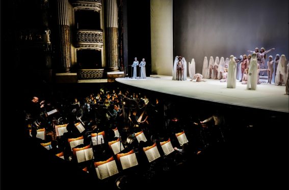 Il sipario si apre poi su un tableau vivant in stile Beecroft: corpi velati, gesti essenziali, un’estetica sospesa che prepara alla narrazione musicale. Riccardo Frizza guida Orchestra e Coro del San Carlo in una partitura che intreccia strumenti antichi e moderni per evocare il mito originario della città. Il coro, in greco, incornicia l’opera dall’inizio alla fine.