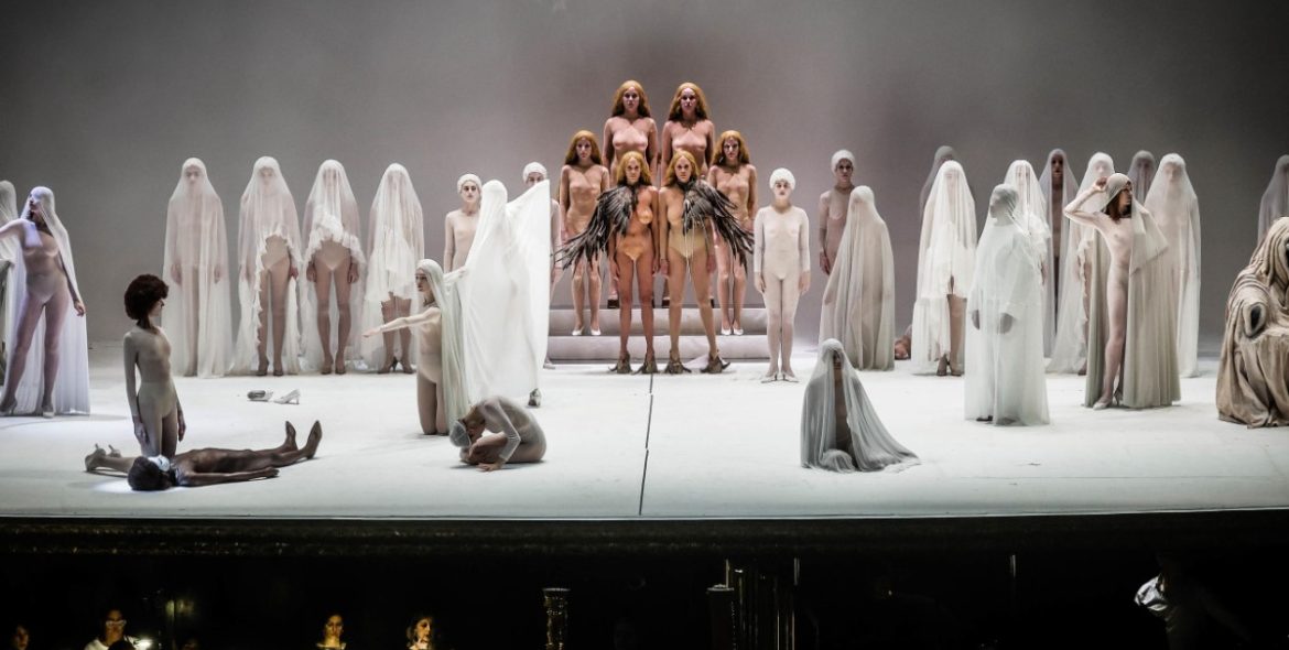 Il sipario si apre poi su un tableau vivant in stile Beecroft: corpi velati, gesti essenziali, un’estetica sospesa che prepara alla narrazione musicale. Riccardo Frizza guida Orchestra e Coro del San Carlo in una partitura che intreccia strumenti antichi e moderni per evocare il mito originario della città. Il coro, in greco, incornicia l’opera dall’inizio alla fine.