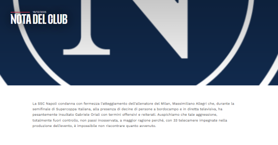 Ma il match di ieri fa discutere tanto per la gestione arbitrale quanto per la polemica nata tra i due club immediatamente a fine partita. Oltre che per la contestata direzione di Zufferli, infatti, gli animi si sono scaldati soprattutto in panchina. Tanto che in una nota diffusa nella mattinata di oggi 19 dicembre, il club partenopeo ha attaccato duramente il tecnico rossonero Massimiliano Allegri per la sua condotta nei confronti di Gabriele Oriali, team manager e viceallenatore del Napoli, auspicando che vengano presi provvedimenti disciplinari a suo carico. L’accusa, prosegue la nota, è quella di aver “pesantemente insultato Oriali con termini offensivi e reiterati alla presenza di decine di persone a bordocampo e in diretta televisiva”. “Con 33 telecamere impegnate nella produzione dell’evento, è impossibile non riscontrare quanto avvenuto”, ha concluso il comunicato, pubblicato anche sul sito web della squadra di De Laurentiis.