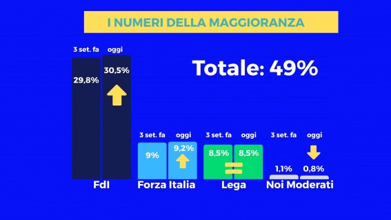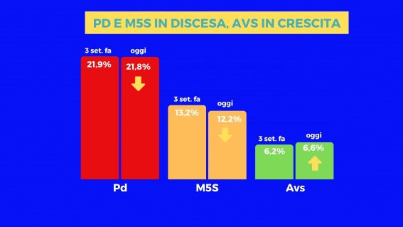 Ai buoni risultati per la maggioranza si contrappongono quelli negativi dei partiti di opposizione. Una perdita di terreno per il centrosinistra. Considerando le ultime rilevazioni, il Partito Democratico scende al 22% dopo una piccola crescita della scorsa settimana. In caduta libera, invece, il Movimento 5 Stelle. Il partito di Giuseppe Conte perde un altro 0,7% nelle ultime tre settimane e si attesta al 12,2%. Cresce Alleanza Verdi e Sinistra, che guadagna lo 0,4% negli ultimi 20 giorni. Stabili Azione e Italia Viva, rispettivamente al 4% e al 2%.