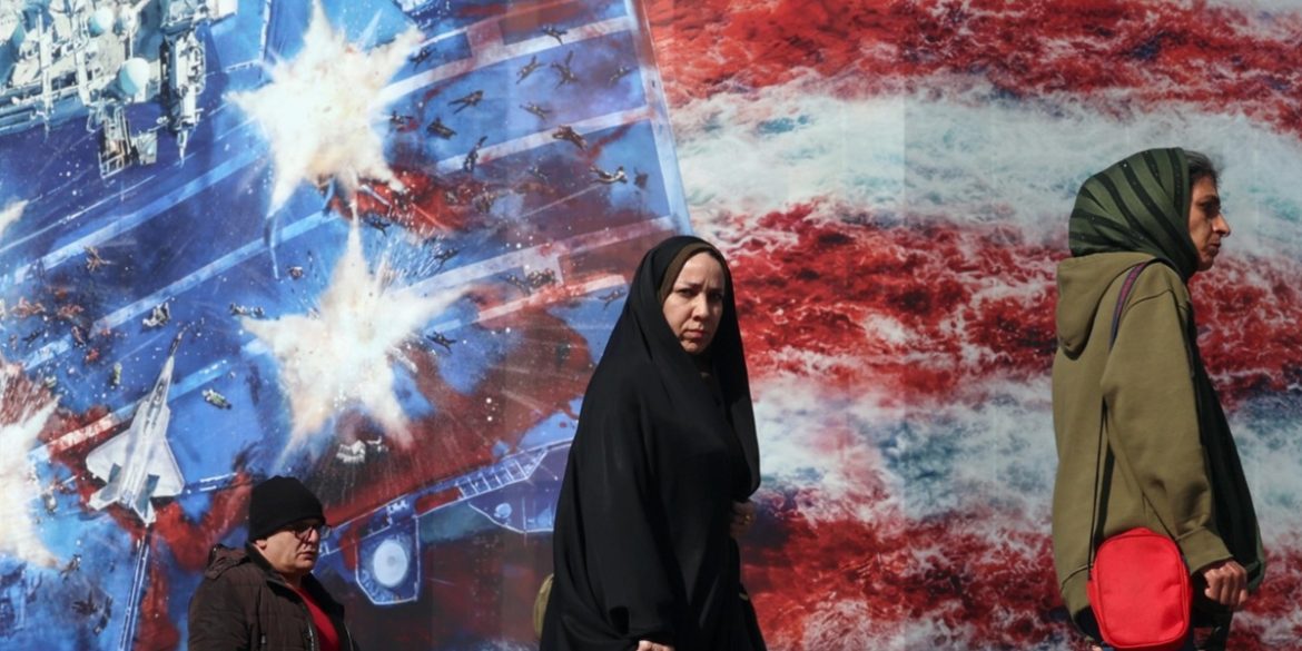 Iraniani camminano davanti a un cartellone pubblicitario anti-USA in piazza Enqelab a Teheran, Iran, 16 febbraio 2026 | Foto Ansa