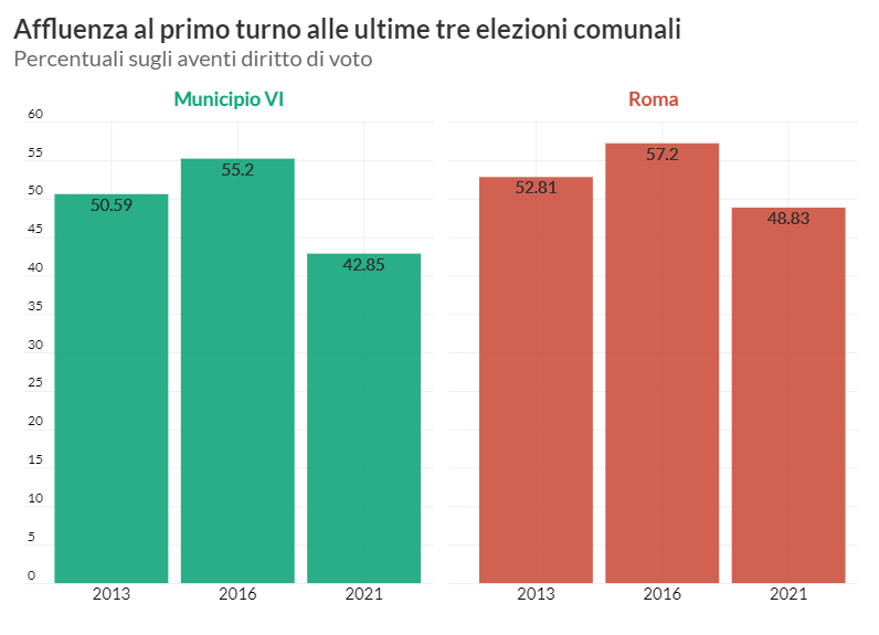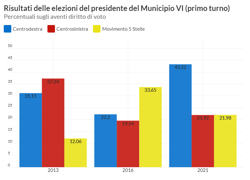 Se cinque anni fa l’astensionismo è stato frenato anche dal successo del Movimento 5 Stelle, che al Municipio VI aveva visto trionfare al ballottaggio il proprio candidato presidente Roberto Romanella con il 72,7%, nelle elezioni appena passate il partito di Giuseppe Conte ha fatto registrare un calo importante. Al primo turno, infatti, il più votato è stato Nicola Franco, della coalizione del centrodestra, con il 43,2%, mentre la candidata grillina Francesca Filipponi ha preso solo il 22% delle preferenze. Un segnale evidente della disistima anche verso la sindaca uscente Virginia Raggi. Lo spiega bene il presidente del Comitato di quartiere, Giovanni Stornelli: “Negli ultimi cinque anni questa giunta ci ha impoverito ulteriormente, creando altri problemi alla città, alla periferia. La sindaca non ha fatto nulla per cambiare questa situazione. I cittadini non l’hanno mai vista, non sanno chi sia”.
