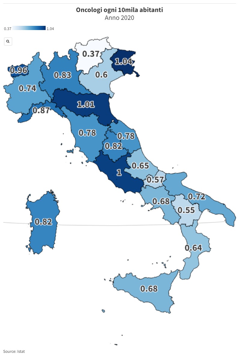 A causa dell’organizzazione regionale della Sanità, gli oncologi non sono distribuiti in maniera uniforme sul territorio nazionale. Si passa da 0,37 ogni 10mila abitanti del Trentino Alto Adige a 1,4 del Friuli Venezia