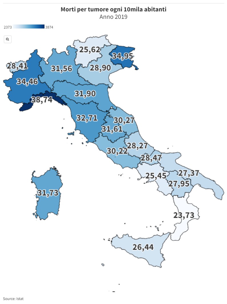La regione con più morti di tumore è la Liguria. In generale il centro nord ha una un numero di morti più alto del sud. “La prima causa di cancro è un fattore buono, ossia l’aumento dell’età media della popolazione, poiché il cancro è una patologia dell’età avanzata. I numeri della Liguria sono in parte spiegati da una popolazione più anziana”, commenta Mario Fusco, direttore del Registro tumori della Campania. I fattori di rischio aumentano all’aumentare dell’età. Le persone continueranno ad ammalarsi, e l’incidenza aumenterà.