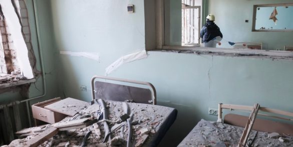 Un soccorritore ucraino ispeziona i danni all’interno di un ospedale maternità colpito da un attacco russo a Zaporizhzhia | Foto Ansa