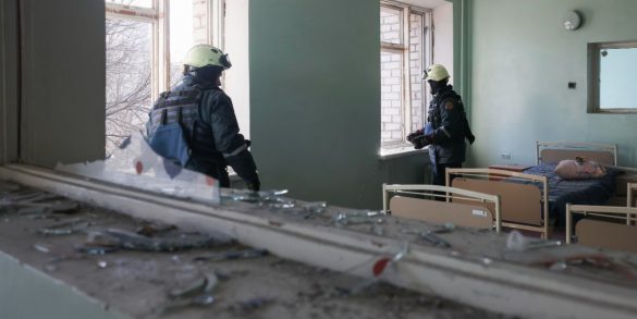 Due soccorritori ucraini ispezionano i danni all’interno di un ospedale maternità colpito da un attacco russo a Zaporizhzhia | Foto Ansa