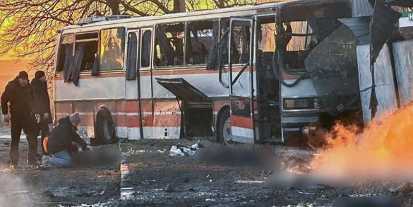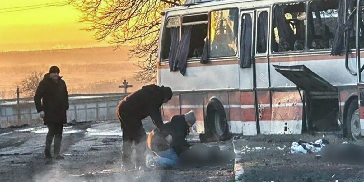 Immagine diffusa dal Servizio statale di emergenza dell’Ucraina che mostra il luogo di un attacco russo contro un autobus civile impegnato nel trasporto di minatori a Ternivka
