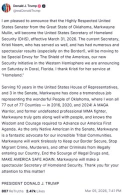 WASHINGTON – Il presidente degli Stati Uniti Donald Trump ha deciso di rimuovere dal suo incarico la segretaria alla Sicurezza Interna Kristi Noem, annunciando la decisione con un messaggio pubblicato sul suo social Truth. Al posto della ‘Ice Barbie’ arriverà il senatore dell’Oklahoma Markwayne Mullin, che assumerà l’incarico entro la fine del mese. Mullin, noto anche per la sua passione per le arti marziali, condivide con l’amministrazione una linea molto dura in materia di immigrazione.