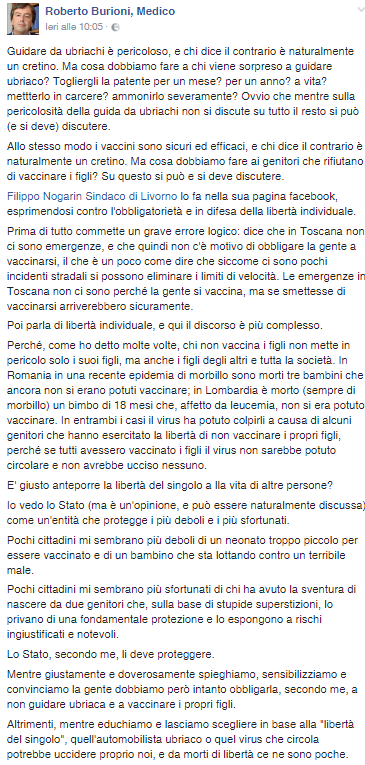 Nella foto, il post di risposta del Dottor Burioni, direttamente dalla sua pagina Facebook indirizzato (con tanto di tag) al Sindaco Nogarin.